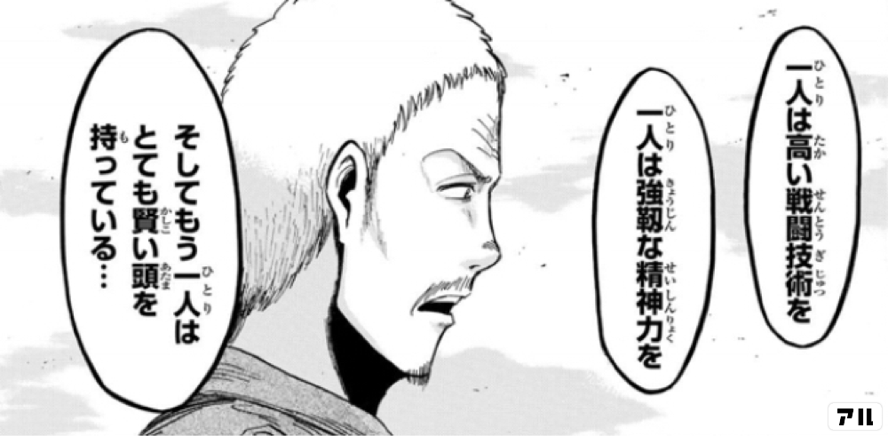 これは、詳細で元の投稿訪問用の 一人は高い戦闘技術を 一人は強靭な精神力を してもう一人は とても賢い頭を 持っている 進撃の巨人 アル のスニペット画像です。 ここに